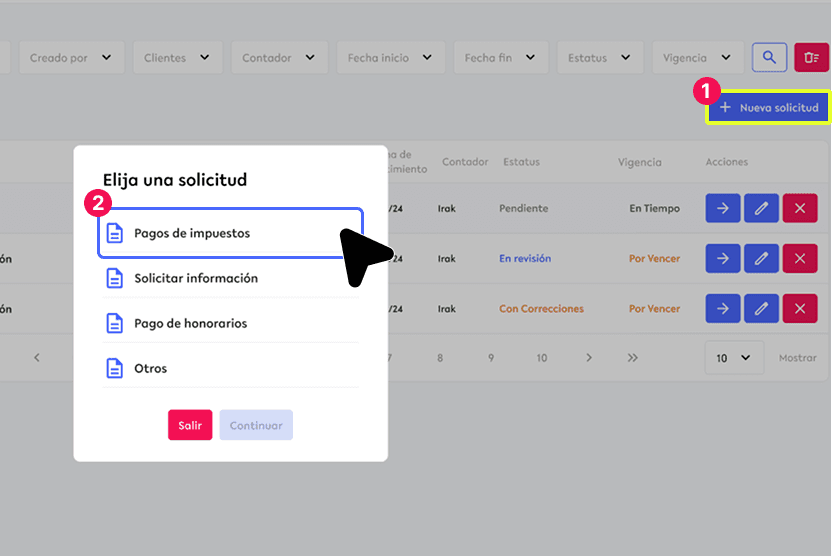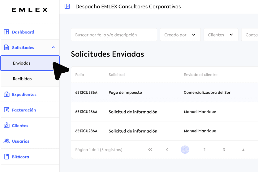 Puedes filtrarlas por folio, estatus, cliente, contador, vigencia y más.